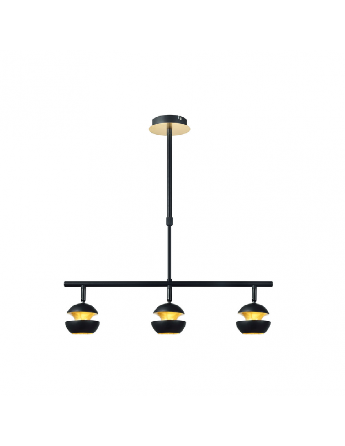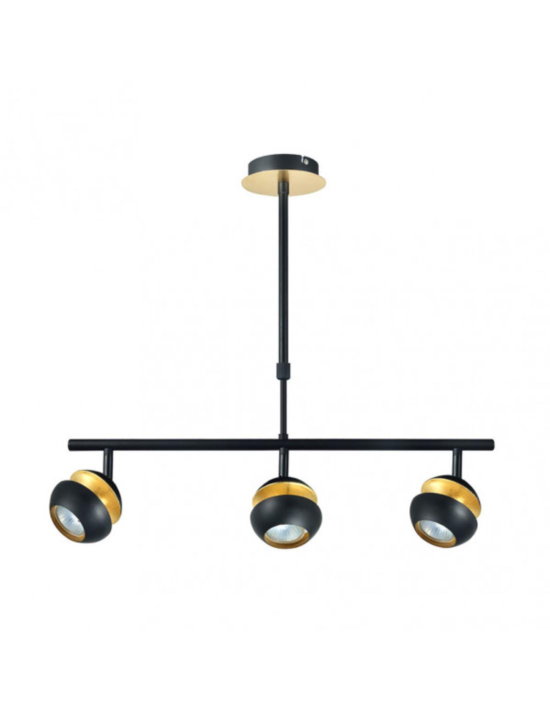 Colgante con tres focos de la serie BEETHOVEN de color NEGRO/ORO. Realizada en metal con tres portalámparas GU10 . Bombillas no incluidas. De diseño moderno y original, combinando el negro con la terminación de pan de oro, con focos redondeados y articulables verticalmente, con un giro horizontal de casi 360º permitiendo así dirigir los puntos de luz hacia cualquier zona de la estancia. Sus dimensiones son regulables en altura de 44<,68X56,5X12 centímetros. Modelo también disponible en color blanco/plata. Se puede completar la colección con la versión de colgante cuatro luces, regleta de cuatro luces, regleta de tres luces, regleta de dos luces, plafón de tres luces y foco de una luz.