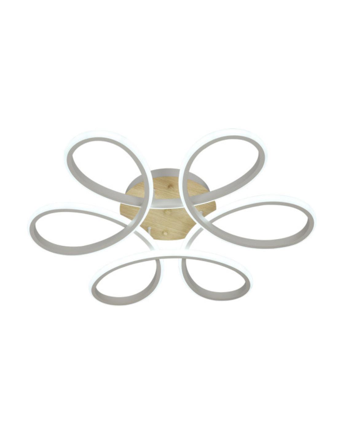 Plafón de la serie BANDEIRA en color BLANCO/HAYA. Realizado en metal, aluminio y acrílico. De diseño futurista muy moderno a la par que elegante, se caracteriza por sus formas curvas y replegadas sobre una pletina en color madera, resultando un original y bonito juego lumínico. Ideal tanto para salas, salones, estancias diáfanas y dormitorios como para espacios de trabajo, dando sensación de profundidad, iluminan con una gran fuente de luz a la vez que decoran la estancia, el diseño de luces que presentan lo hacen el centro de la habitación que iluminan. Posee tecnología LED INTEGRADA, proporcionando un gran ahorro, con una potencia de 130 vatios y 14300 lúmenes, con TRES TEMPERATURAS SELECCIONABLES DE LUZ, 3000-4000-6500ºK (luz cálida, natural y blanco frío) pudiendo elegir en cada momento la que mejor se adapte a la actividad a realizar. Viene con MANDO A DISTANCIA incluido, REGULABLE EN INTENSIDAD y MEMORIA de color. Tiene unas dimensiones de 12x61x61 centímetros. Disponible en esta serie de varios diseños de 88w, 104w y 130w para elegir a juego la combinación de ellos que mejor se adapte a su decoración, todos en color blanco/haya y en negro/madera.