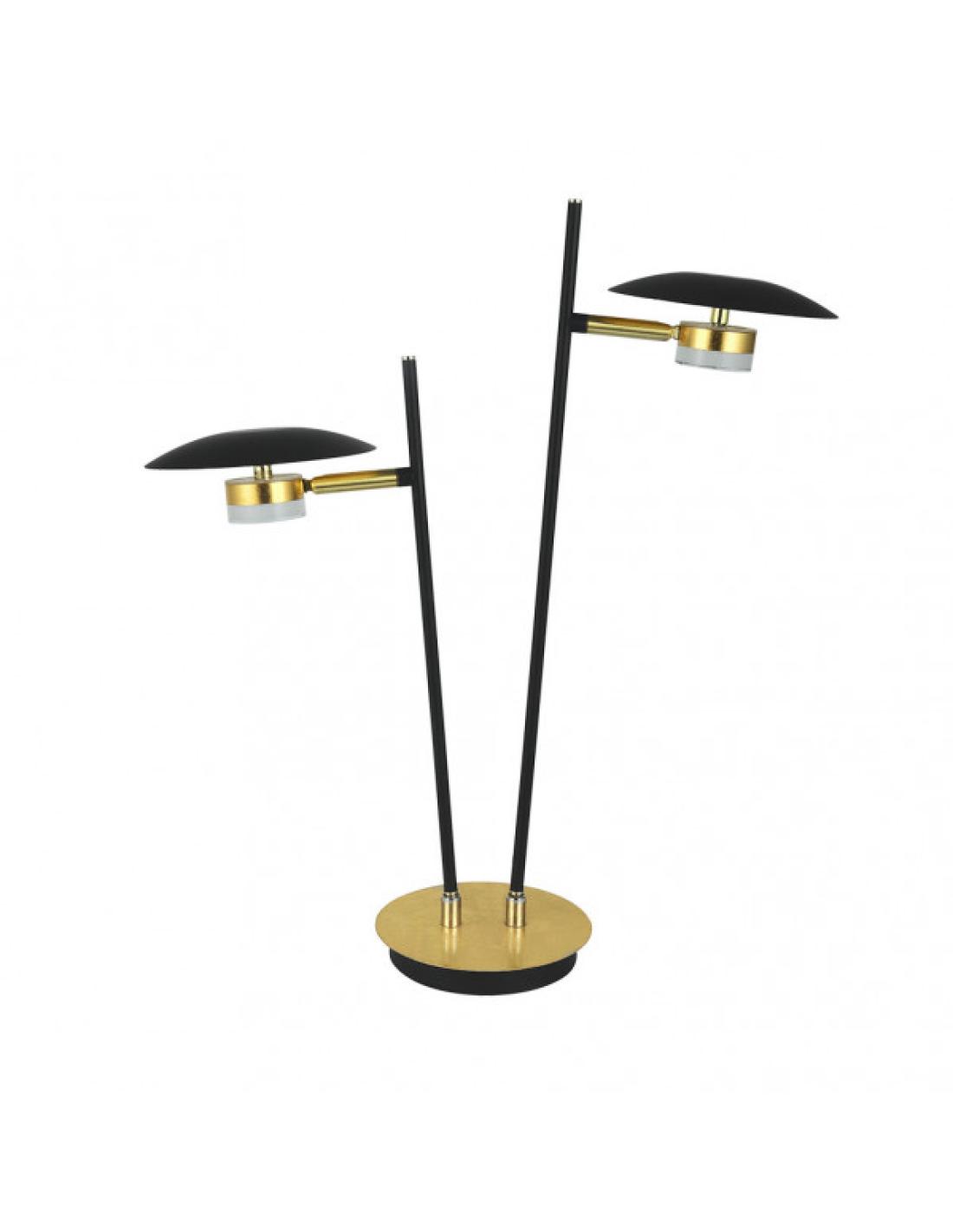 Sobremesa de dos luces serie CIUDAD DEL CABO de color NEGRO/ORO. Se compone de dos brazos DIRIGIBLES, realizados en metal, que nacen de una base central, con una especie de pantallas también metálicas que coronan los focos ORIENTABLES, pudiéndose dirigir la luz directamente a la zona que se prefiera iluminar. TECNOLOGÍA LED INTEGRADO, con una potencia de 12 watios y 1080 lúmenes. Tiene una temperatura de luz de 4000K ( blanco natural). Su original diseño ofrece una versión sofisticada del estilo moderno, resultando una composición muy elegante la combinación del negro con la terminación en pan de oro, ideal para iluminar cualquier rincón en salones u hogares con estilos decorativos afines, e incluso acorde con el nuevo estilo Industrial, también idóneo para zonas de trabajo. Su dimensión es de 52x32x15 centímetros. En esta familia, podemos encontrar una amplia gama de diseños como son el colgante de dos y tres luces, lámparas de cuatro y cinco luces, sobremesas de una y dos luces y el pie de salón. Todos ellos también disponibles en color blanco/plata.