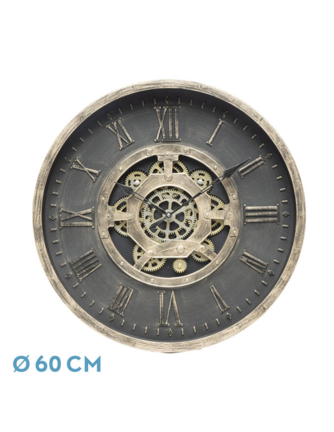 Reloj de Pared de la serie ADAMUZ en color NEGRO/ORO. Realizado en policarbonato y cristal. Presenta un diseño clásico y elegante, imitando a los relojes antiguos pero también muy acorde con decoraciones modernas, Vintage o Industrial. Con números romanos y detalles en color oro envejecido, sus agujas de diseño y sus engranajes con movimiento que están a la vista, hacen que resulte una composición muy decorativa y vistosa. Tecnología de Cuarzo y funcionamiento silencioso, sus agujas tienen movimiento continuo. Funciona con 3 pilas alcalinas AA, pilas no incluidas. Tiene unas dimensiones de 60x60x7 centímetros.