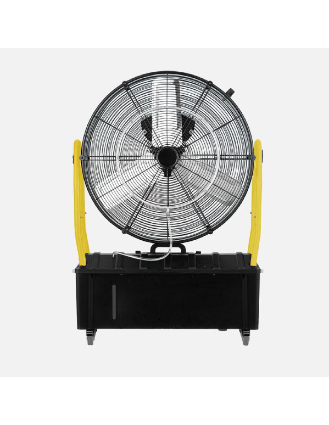 Ventilador Industrial de la serie EXCALIBUR con NEBULIZADOR Y TANQUE DE AGUA DE 25 LITROS, en color NEGRO/AMARILLO con tres aspas y tres velocidades. Gracias a su función nebulizadora, refresca y humidifica rápidamente cualquier espacio, pulveriza 11400ml/h partículas de agua, lo que lo hace muy útil para solares, naves, terrazas, patios y espacios abiertos. Su cabezal es ORIENTABLE, con lo que puede redirigir el aire a la zona deseada. Realizado en metal, aluminio y policarbonato. Motor AC. Tiene una potencia de 300 vatios. Presenta unas dimensiones de 101x71x30 centímetros. Viene con ruedas multidireccionales para desplazar facilmente.